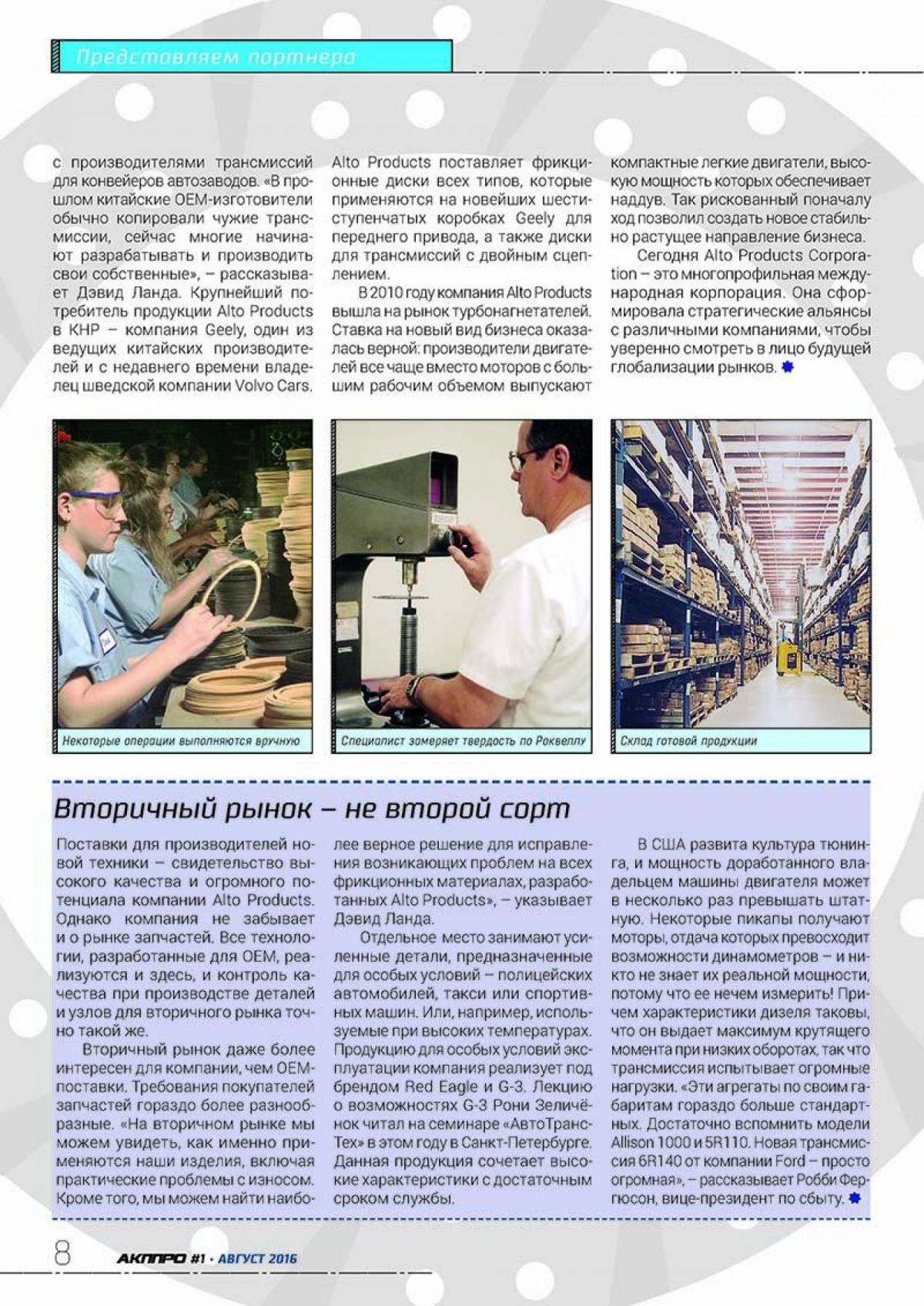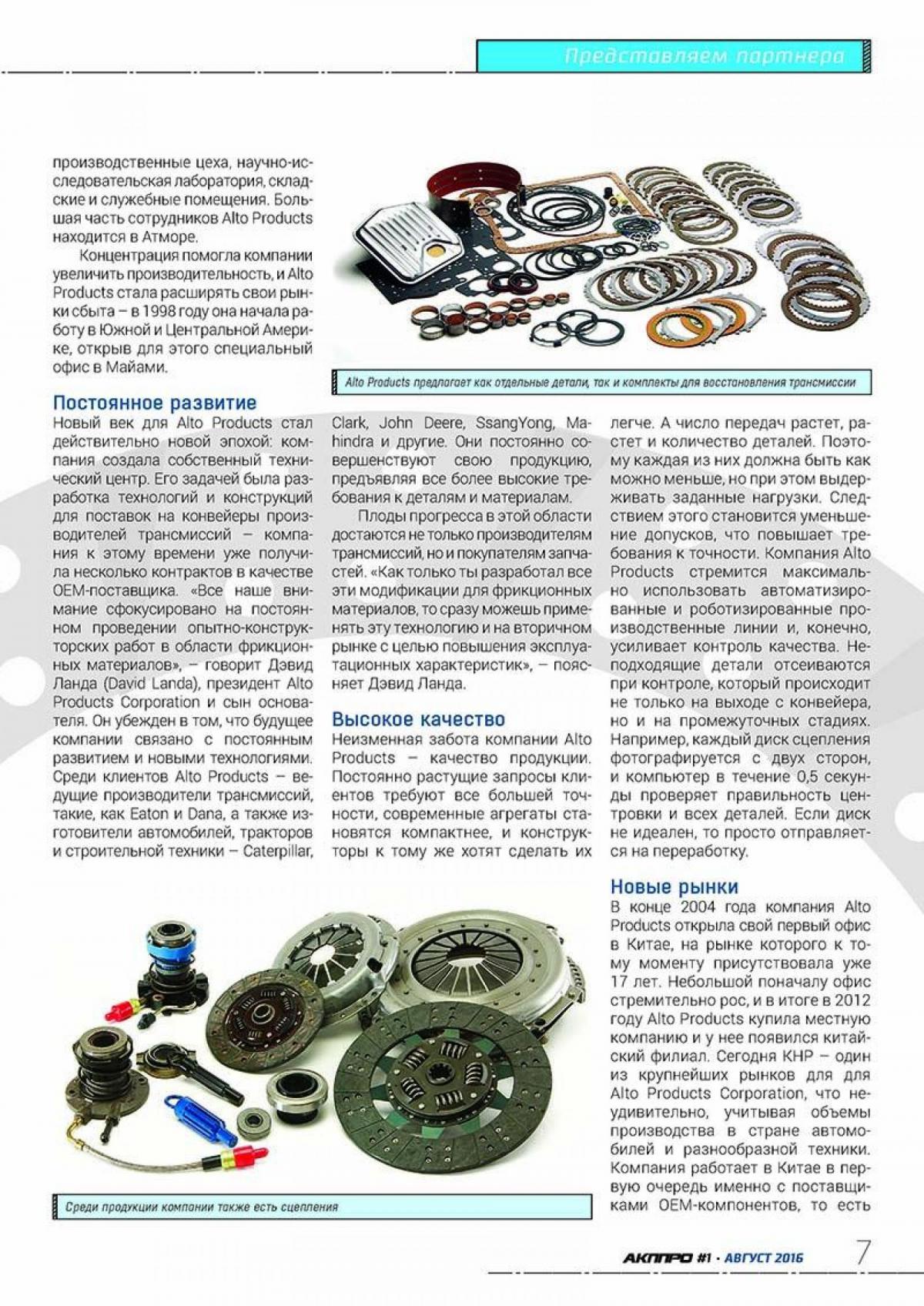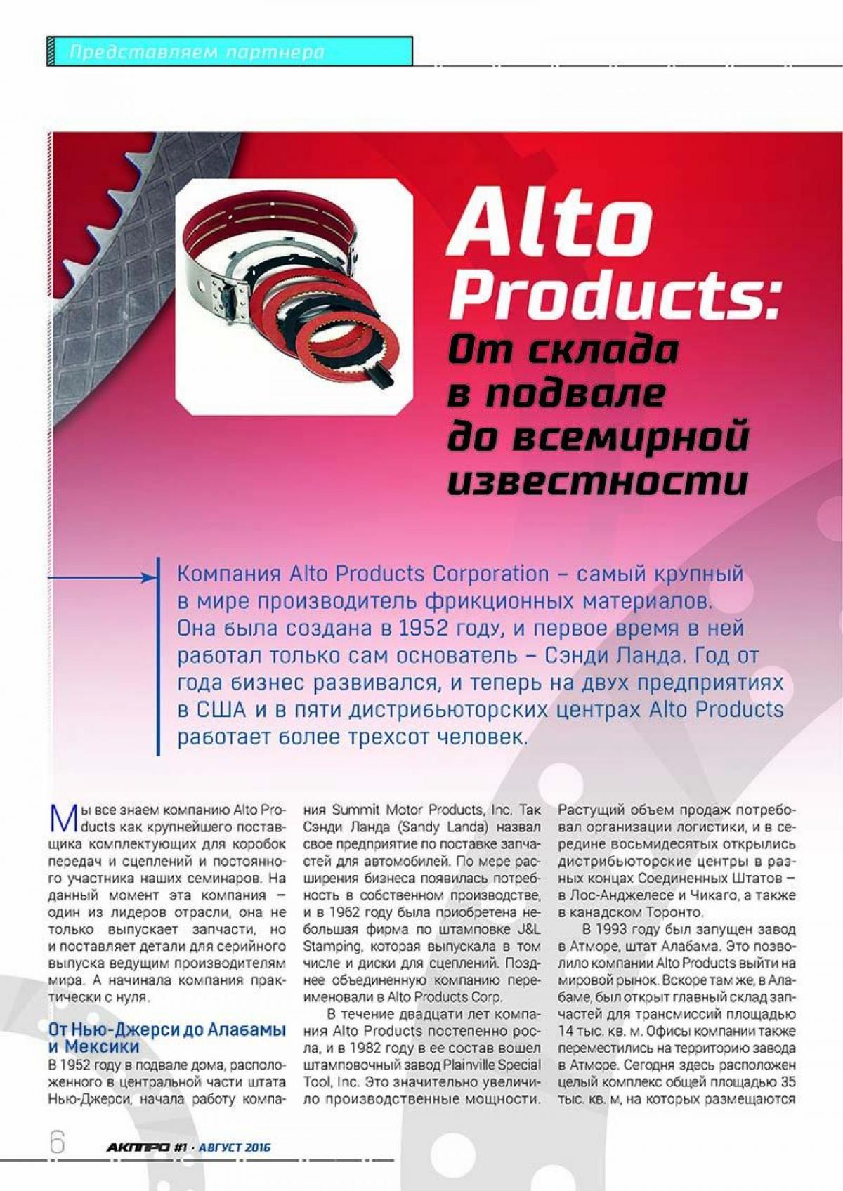 Компания Alto Products Corporation – самый крупный в мире производитель фрикционных материалов. Она была осоздана в 1952 году, и первое время в ней работал только сам основатель – Сэнди Ланда. Год от года бизнес развивался, и теперь на двух предприятиях в США и в пяти дистрибьюторских центрах Alto работает более трехсот человек.