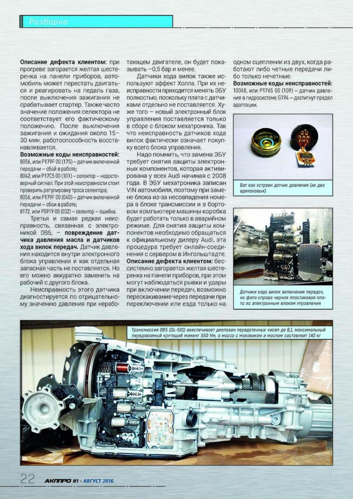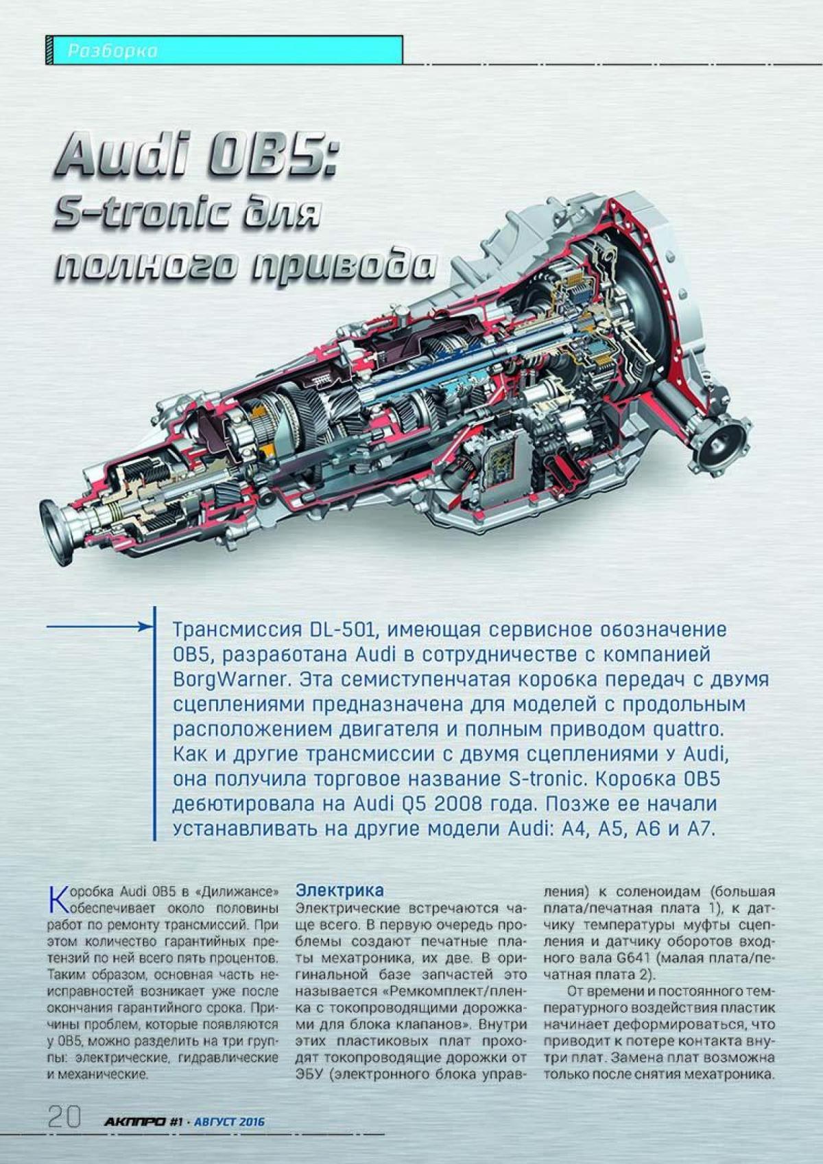 стр. 16 ТехникаТрансмиссия DL-501, имеющая сервисное обозначение 0B5, была разработана Audi в сотрудничестве с компанией BorgWarner. Эта семиступенчатая коробка передач с двумя сцеплениями предназначена для моделей с продольным расположением двигателя и полным приводом quattro. Как и другие трансмиссии с двумя сцеплениями у Audi, она получила торговое название S tronic. Коробка 0B5 дебютировала на Audi Q5 2008 года. Позже ее начали устанавливать на другие модели Audi: A4, A5, A6 и A7.