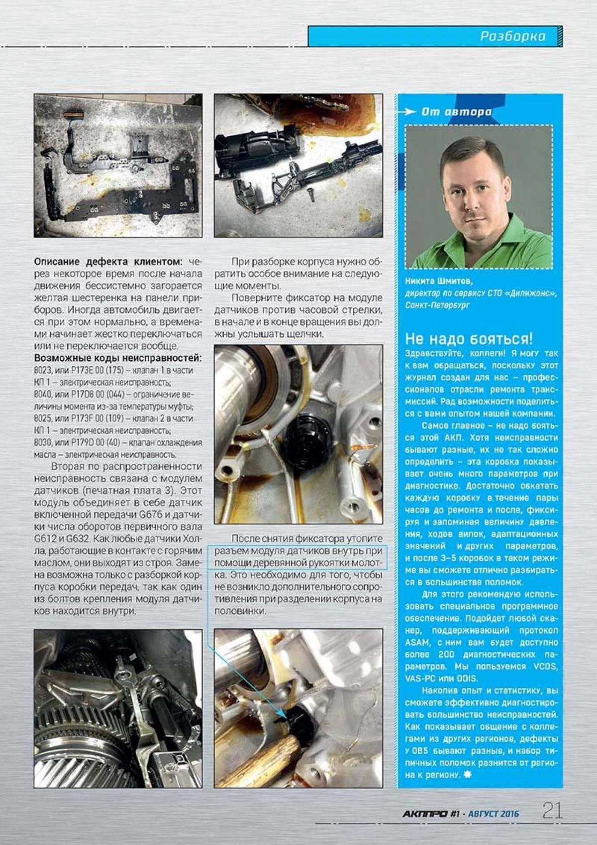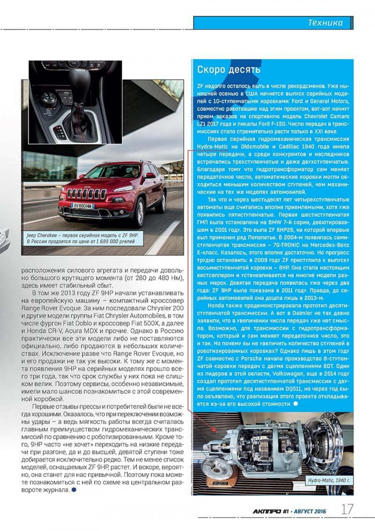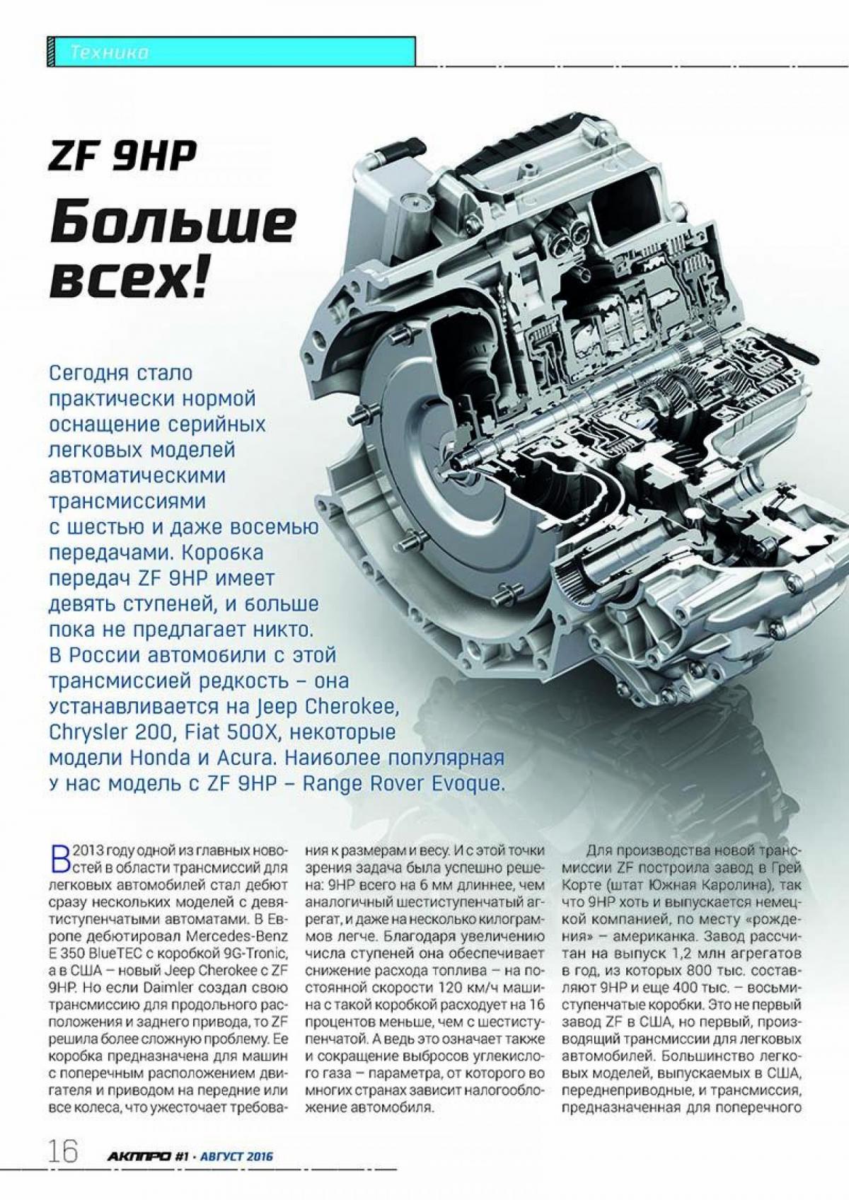 стр. 6 Представляем партнераСегодня стало практически нормой оснащение серийных легковых моделей автоматическими трансмиссиями с шестью и даже восемью передачами. Коробка передач ZF 9HP имеет девять ступеней, и больше пока не предлагает никто. В России автомобили с этой трансмиссией редкость – она устанавливается на Jeep Cherokee, Chrysler 200, Fiat 500X, некоторые модели Honda и Acura. Наиболее популярная у нас модель с ZF 9HP – Range Rover Evoque.