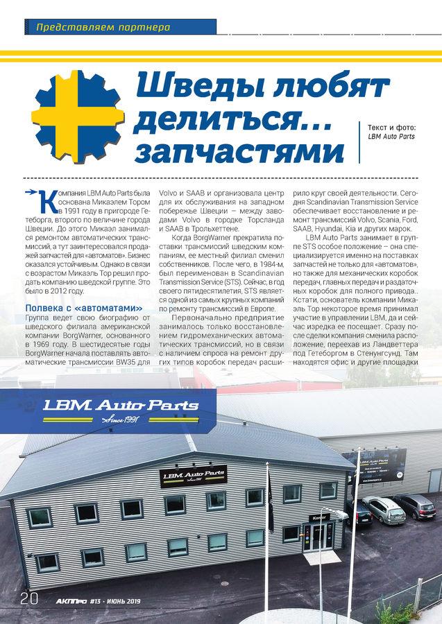 стр. 12 АвтоТрансТехКомпания LBM Autoparts была основана Микаэлем Тором в 1991 году в пригороде Гетеборга, второго по величине города Швеции. До этого Микаэл занимался ремонтом автоматических трансмиссий, а тут заинтересовался продажей запчастей – не только для «автоматов», но также для механических коробок передач, главных передач и раздаточных коробок для полного привода. Бизнес оказался устойчивым. Однако в связи с возрастом Микаэль Тор решил продать компанию шведской группе. Это было в 2012 году.