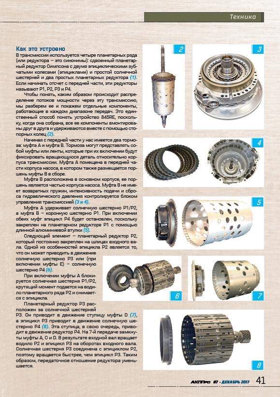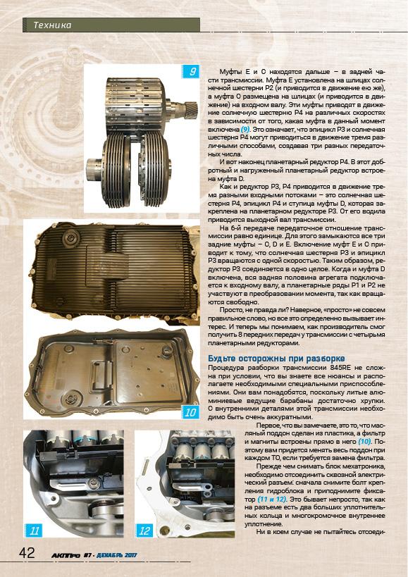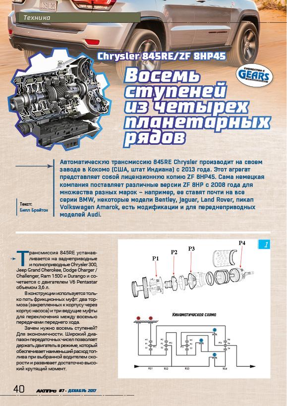 Трансмиссия Chrysler 845RE – родная «сестра» популярной и на европейских моделях ZF 8HP45, и их конструкция практически не различается. Подробное описание – в статье Билла Брайтона в журнале Gears, перевод которой мы публикуем. Стр. 40