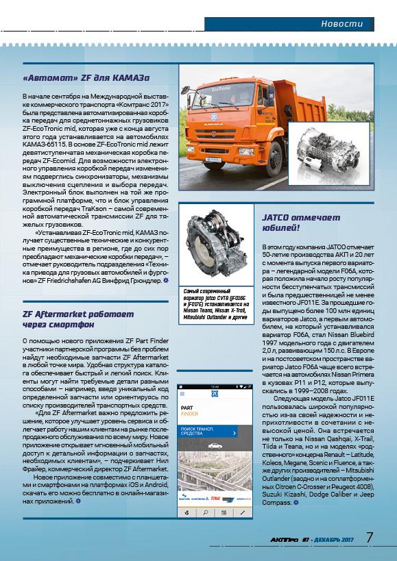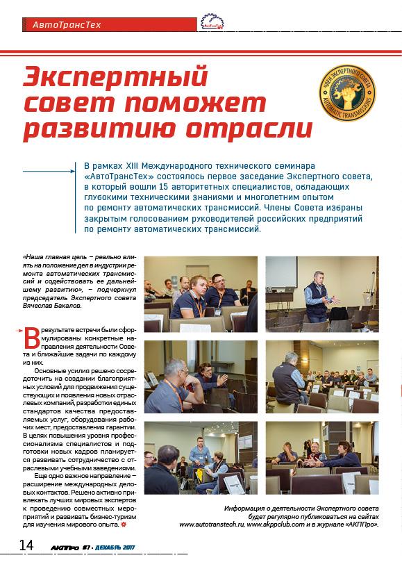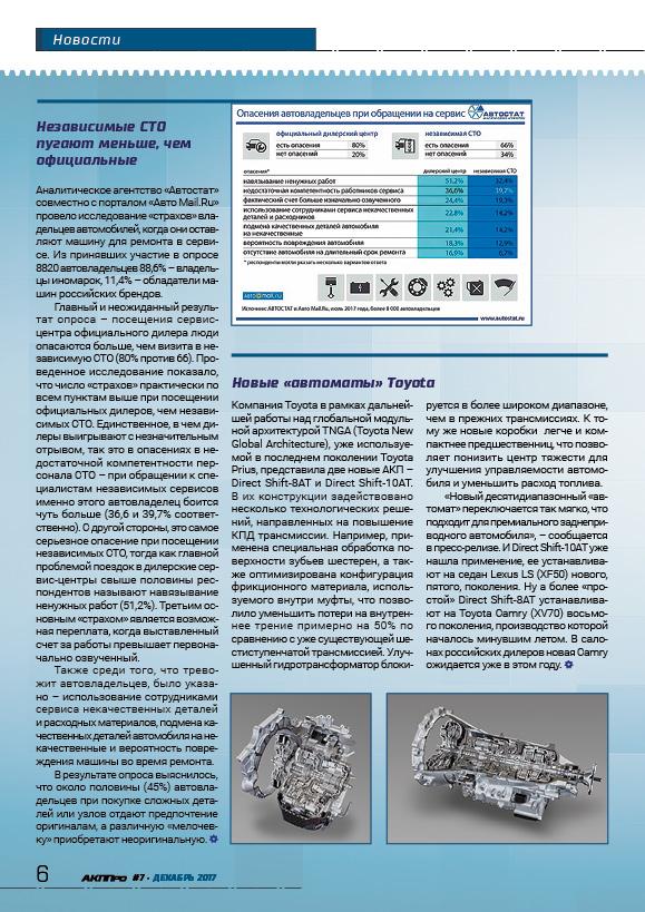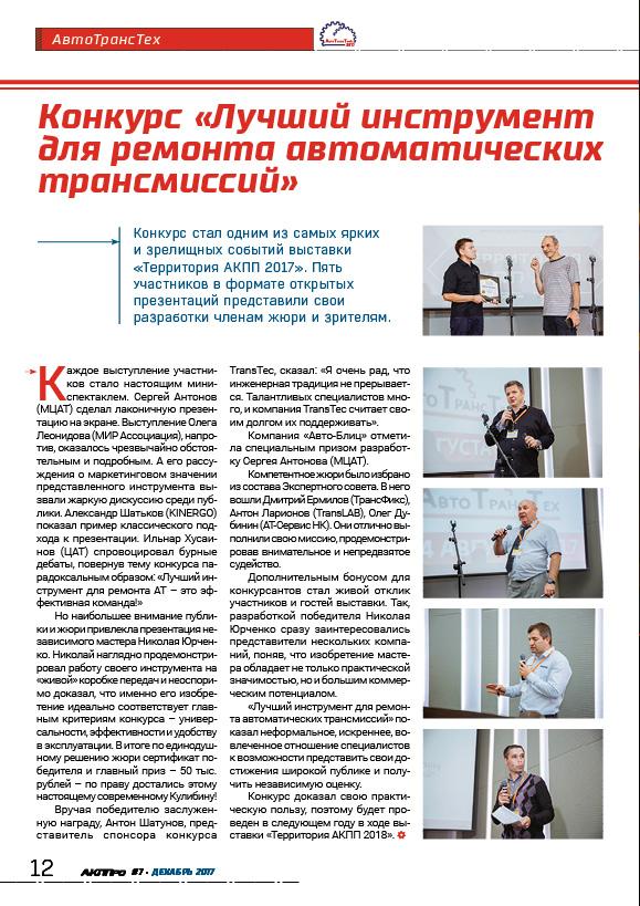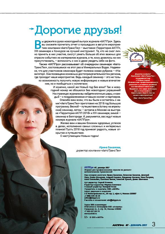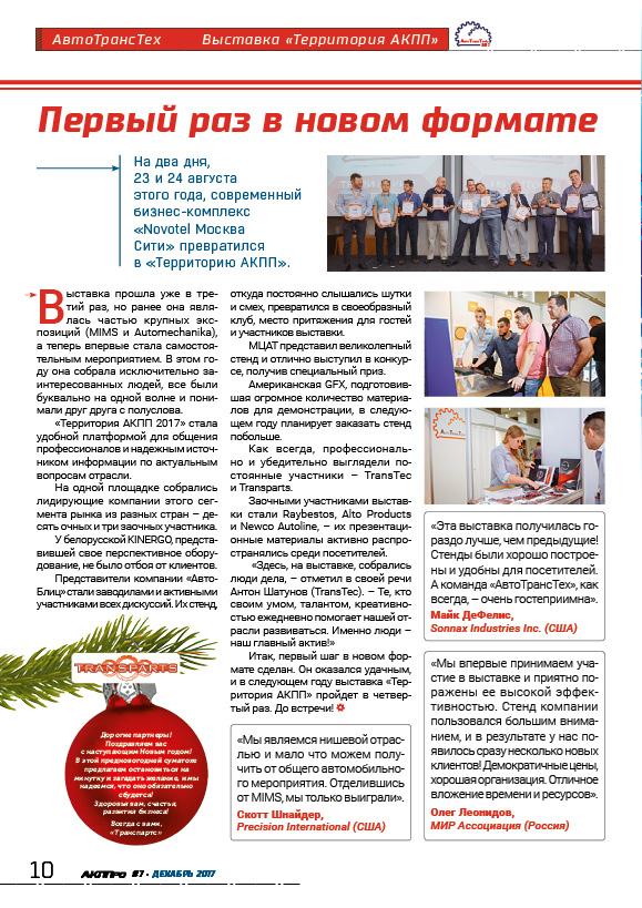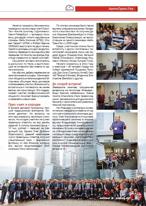 В декабрьском номере журнала мы рассказываем о важнейших событиях для отрасли в уходящем году: международной выставке «Территория АКПП» в Москве (стр. 10), конкурсе на лучший инструмент (стр. 12), создании Экспертного совета и его планах (стр. 14). И, конечно, о прошедшем в августе семинаре «АвтоТрансТех» на стр. 8.