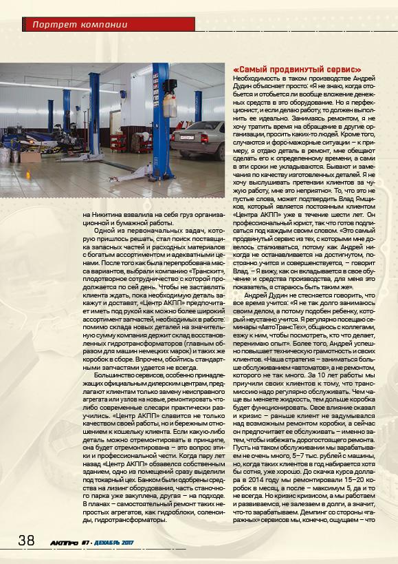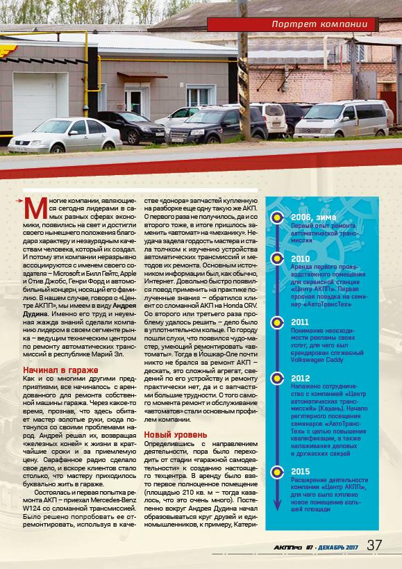 стр. 32 Школа АКПП-клубаИстория компании «Центр АКПП» из Йошкар-Олы как нельзя лучше подходит для новогоднего номера. Рассказ о том, как терпение, труд и настойчивость в достижении своей цели помогают достичь небывалых высот, типичен для рождественских сказок. Но в нашем случае это вовсе не сказка, а настоящая быль.